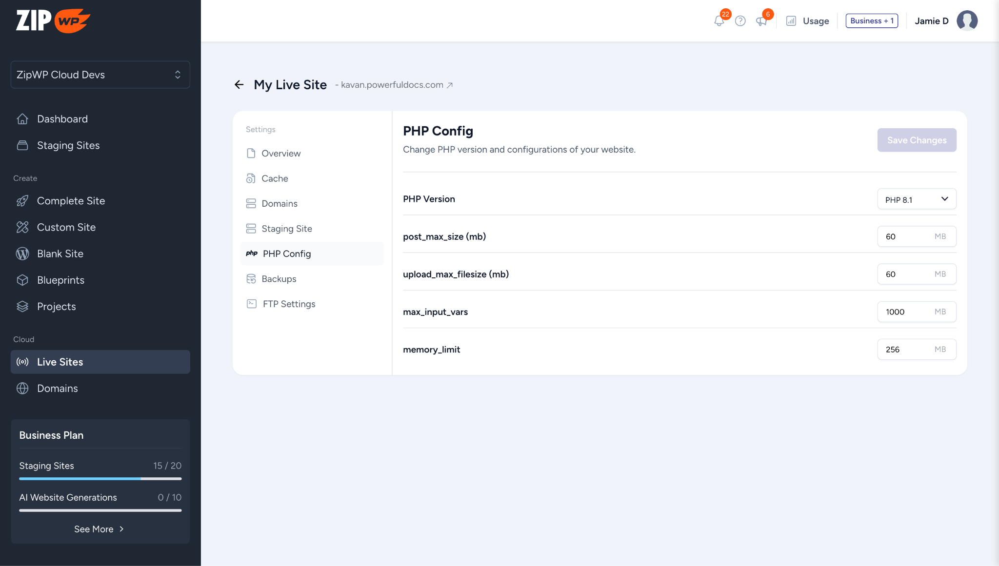 Adjust PHP settings (e.g., version, limits) to match your site’s needs.