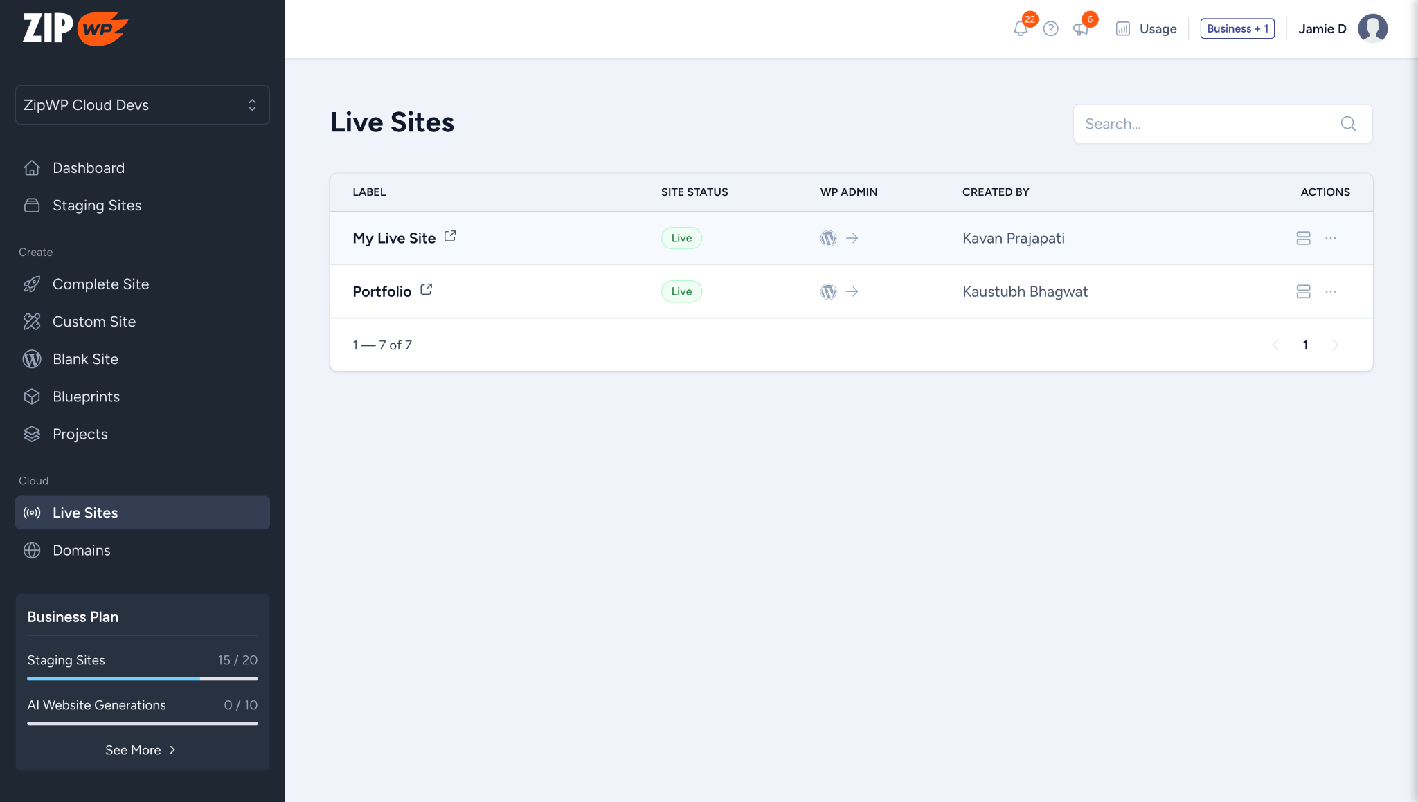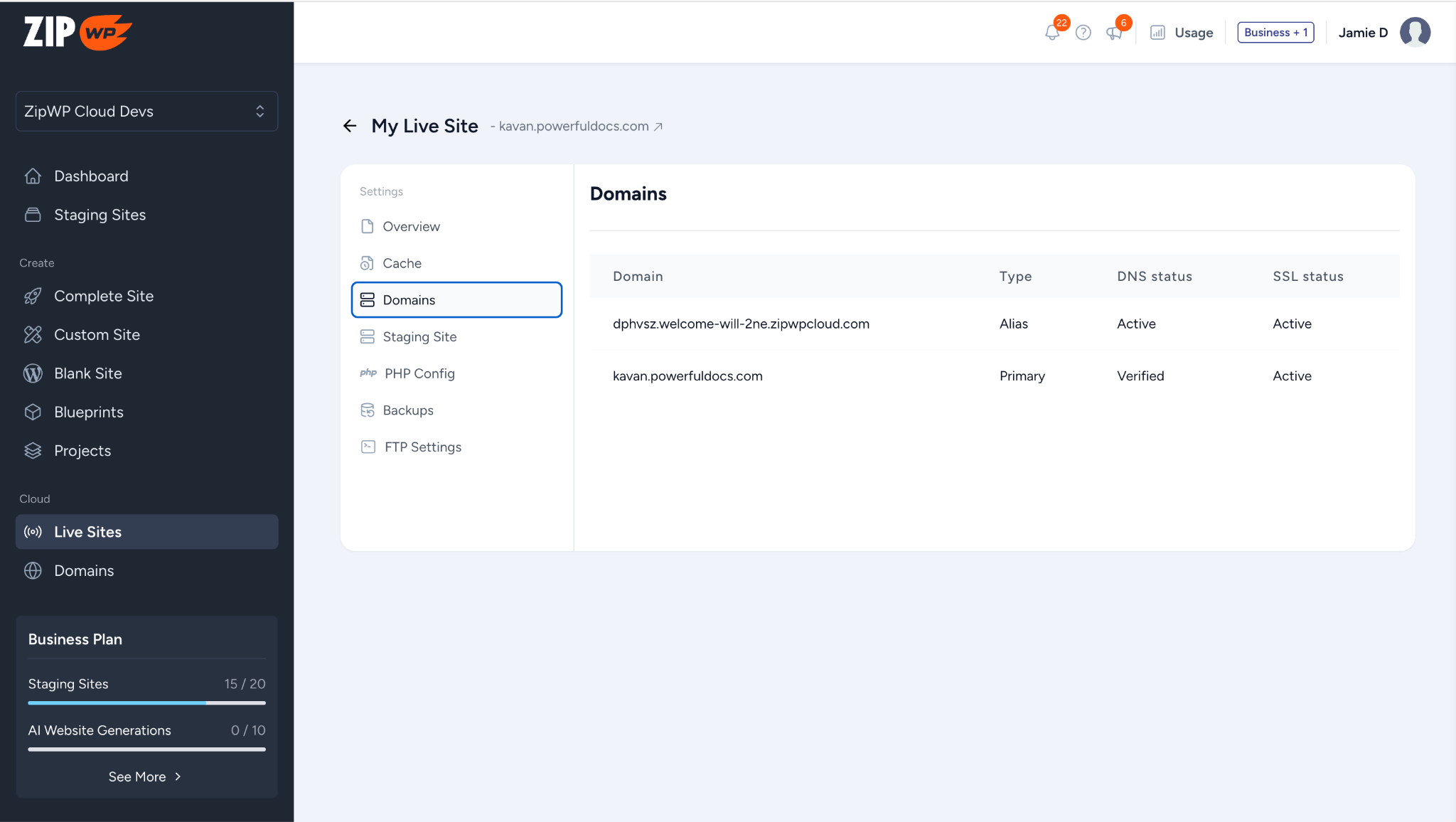 The ZipWP Cloud Dashboard is where you manage all your live websites, domains, and hosting settings.