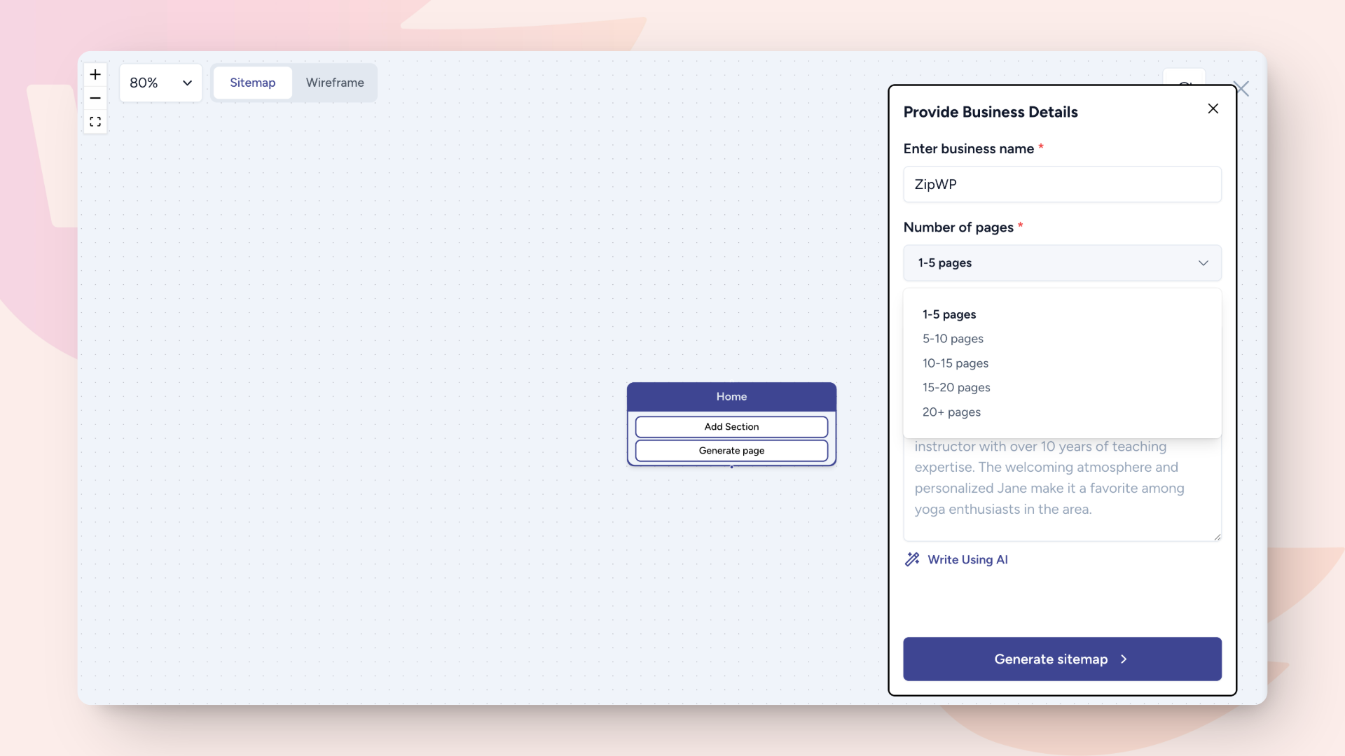 Once your sitemap is ready, ZipWP generates a wireframe—a simplified version of your site’s layout.