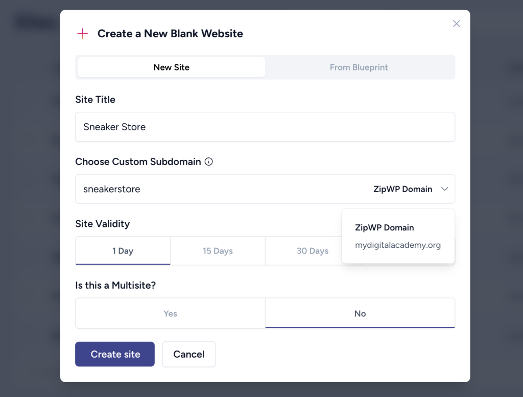 On top of custom subdomains, you can also connect your own root domain to ZipWP. This allows all your websites to have your personal or business domain instead of ours, giving you a fully branded experience. For example: course.mydigitalacademy.org.